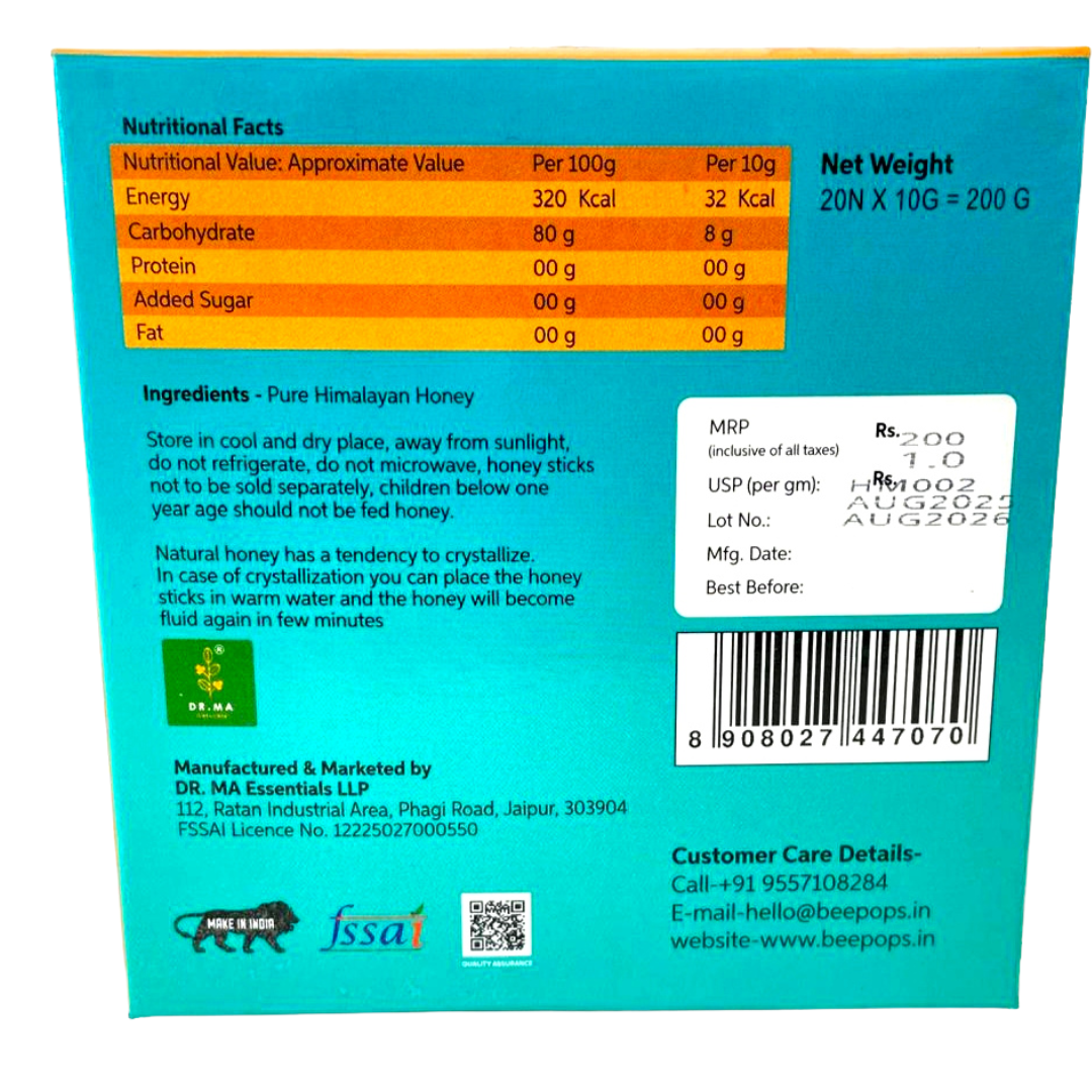 Enjoy your daily dose of pure Himalayan honey — anytime, anywhere — with BeePops™ Honey Sticks. Each stick contains just the right amount of honey, making it easy to add to tea, school tiffins, or enjoy as a quick energy booster.
